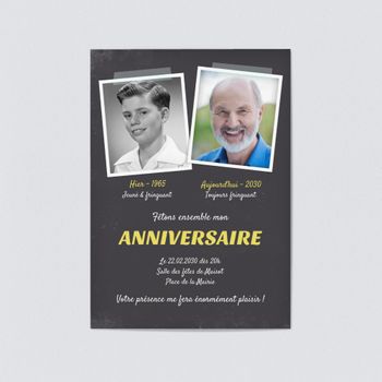 Insérez vos photos dans les polaroïds et modifiez le texte proposé !Texte Invitation anniversaire 50 ans Tout comme le vin, je me bonifie avec l'âge Alors venez voir comme je suis devenu bon à l'occasion de mes 50 ans !Personnalisez votre invitation anniversaire 50 ans pour fille et garçon Modèles de cartes d'invitations à personnaliser et à imprimer